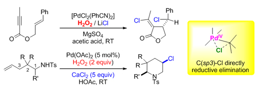 中国科学院上海有机化学研究所金属有机化学国家重点实验室刘国生课题组一直致力于新型烯烃双官能化反应的研究,尤其是发展温和条件下的绿色氧化反应。早在2008年,该课题组就发现利用30%的双氧水作为氧化剂,利用氯化锂为无机氯源实现了金属钯催化的烯烃的烯基氯化反应;其中,相对于氧气较低的氧化能力,双氧水具有很强的氧化能力可以将Csp3-PdII中间体氧化形成高价Csp3-PdIV中间体,随后经还原消除形成Csp3-Cl键(Angew. Chem., Int. Ed. 2008, 47, 5442)。随后发现通过对该催化体系进行改善,成功地实现了烯烃分子内的胺氯化反应,以非常高的区域、非对映体选择性得到氯代哌啶类化合物(Chem. Eur. J. 2012, 18, 451)。机理研究首次表明反应经历一个可逆的胺钯化,而且碳-氯键的形成是通过高价钯中间体的直接还原消除过程进行。
