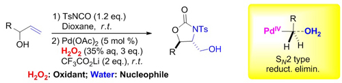 最近,该课题组在前期研究的基础上,利用双氧水作为氧化剂,实现了钯催化的烯烃分子内的胺羟化反应,可以从简单的丙烯醇出发,非常高效、高选择性的合成2-氨基-1,3-二醇类化合物(J. Am. Chem. Soc. 2014, 136, 1766)。反应中碳-氧键的形成是通过高价Csp3-PdIV中间体的还原消除进行的,而且主要是双氧水溶液的水分子作为亲核试剂以SN2形式得到的,而这一现象在金属催化反应中并不多见。上述工作为以后研究金属钯催化的绿色氧化反应提供了新的选择和思路。