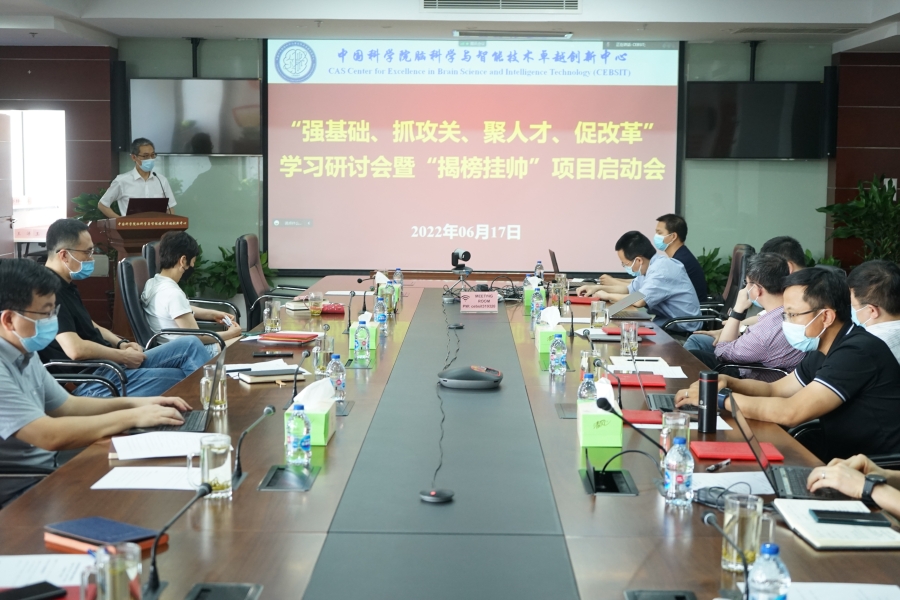 为贯彻落实中国科学院2022年度工作会议精神,推进落实《中国科学院“基础研究十条”实施方案》及其2022年重点任务,准确把握“聚焦主责主业、狠抓工作落实”的年度工作总基调,中国科学院脑科学与智能技术卓越创新中心于2022年6月17日召开“强基础、抓攻关、聚人才、促改革”主题学习研讨会暨“揭榜挂帅”项目启动会,以“揭榜挂帅”团队攻关机制为主抓手,进一步统一思想、提高认识、凝心聚力,统筹做好全年各项工作。中心领导班子成员、所务委员、党委委员、“揭榜挂帅”首席科学家、各研究组长以及管理支撑部门负责人近70人参加了会议,会议由中心副主任(主持工作)杜久林主持。根据疫情防控要求,会议采取线上+线下方式召开。