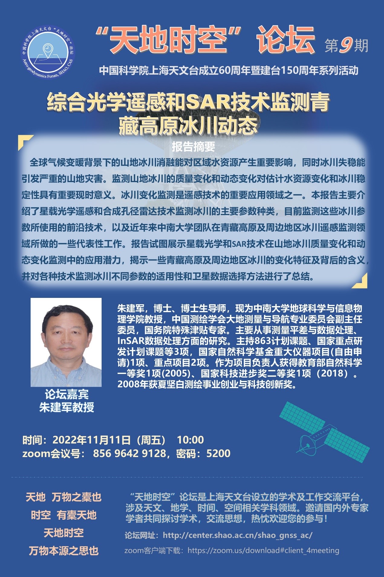 2022年11月11日,第九期“天地时空”论坛通过线上和线下相结合的方式在我台顺利举行。本期论坛是中国科学院上海天文台成立60周年暨建台150周年系列活动之一,论坛邀请了中南大学地球科学与信息物理学院的朱建军教授做了题为《综合光学遥感和SAR技术监测青藏高原冰川动态》的学术报告。