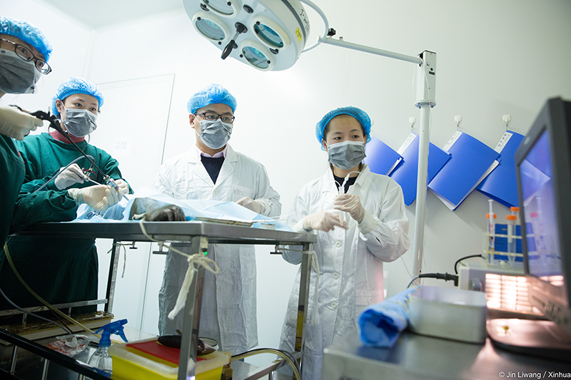 研究员刘真、兽医王燕、聂艳红、许玉婷等实验人员进行取卵手术操作