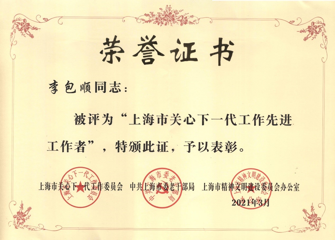 日前,上海市关心下一代工作委员会、中共上海市委老干部局、上海市精神文明建设委员会办公室联合表彰了上海市关心下一代工作先进集体和先进个人。中国科学院上海硅酸盐研究所退休党员李包顺荣获“上海市关心下一代工作先进工作者”称号。