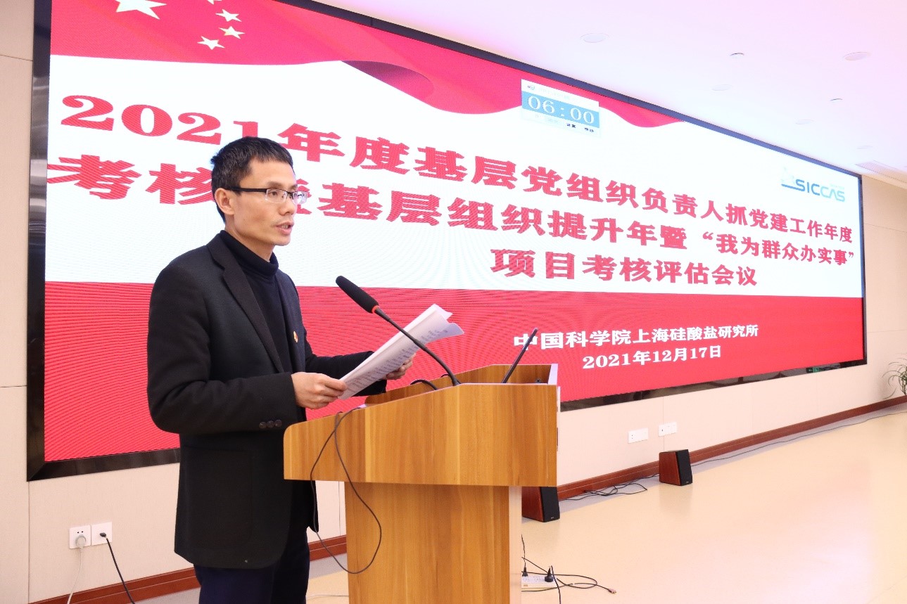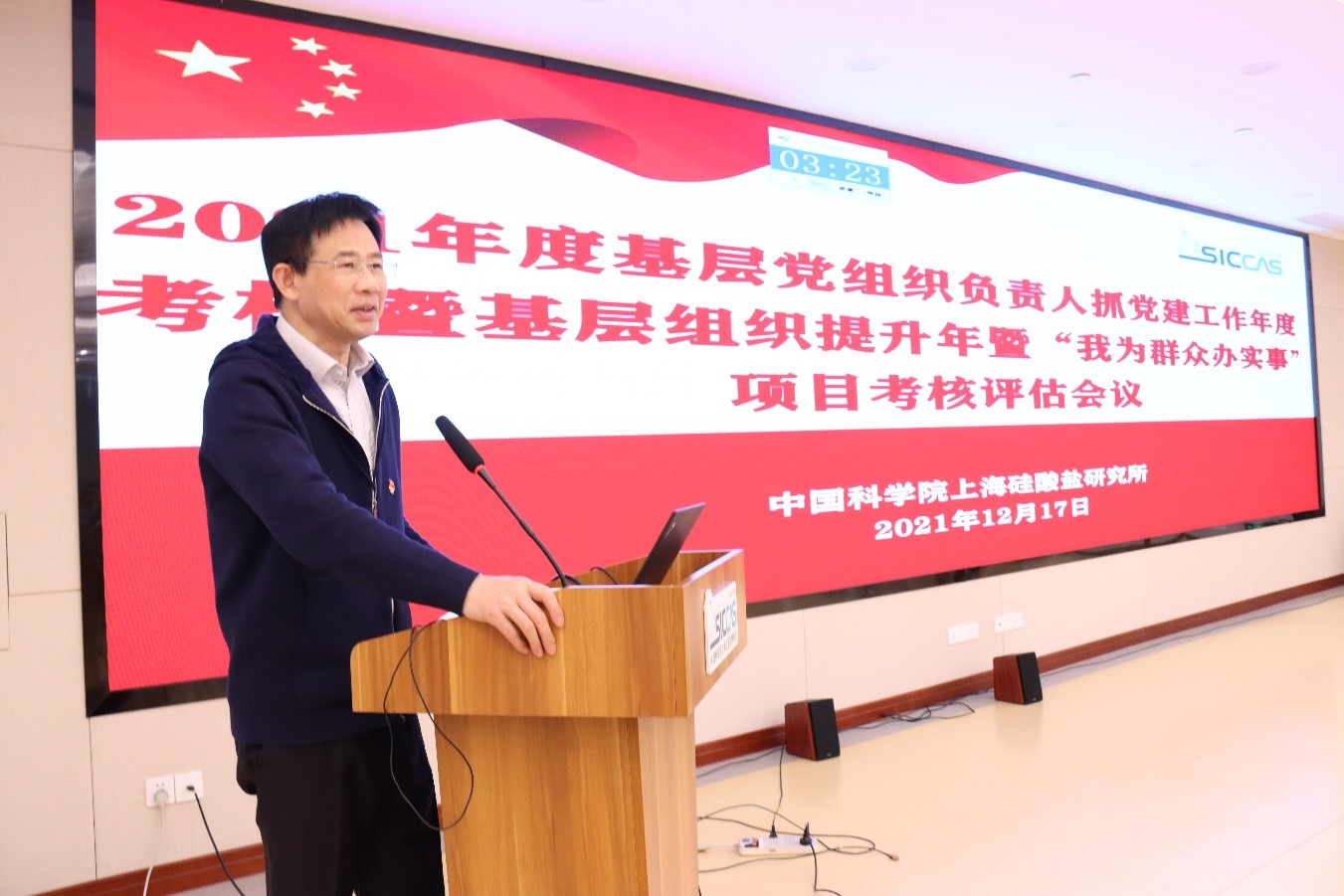 12月17日下午,中国科学院上海硅酸盐研究所召开2021年度基层党组织负责人抓党建工作年度考核暨“基层组织提升年” 活动总结评估会。上海硅酸盐所领导班子成员、两委委员、业务部门负责人、职能部门负责人和党支部(总支)书记等参加了会议,会议由所党委副书记、纪委书记杨建华主持。
