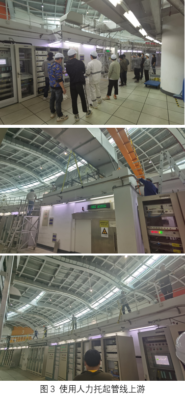 经现场研究讨论,大家快速制定形成了周密的维修处置方案,分工明确,步骤清晰。说干就干,维修的第一步是将管线上下游3处L段法兰脱开,这其中包括存在泄漏问题的2个,再解开约束管线的一系列卡箍,这样使得管线的内管抽出时,整个管线具备活动的空间。第二步是将脱开的管线妥善固定,由于管线长度20米以上,首先使用大厅的航吊将管线下游吊起悬空,然后用4根吊带将上游管线在4处抬起,借助隧道顶端护栏以及人力,顺利将管线的内管抽出。第三步,更换密封材料。第四步,重新插入内管,锁紧法兰,完成管线的连接,复位所有卡箍。
