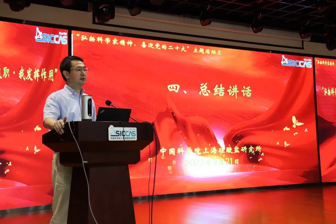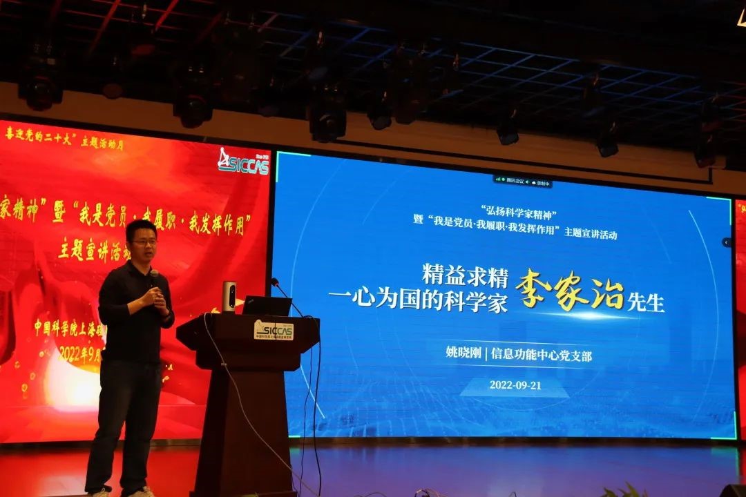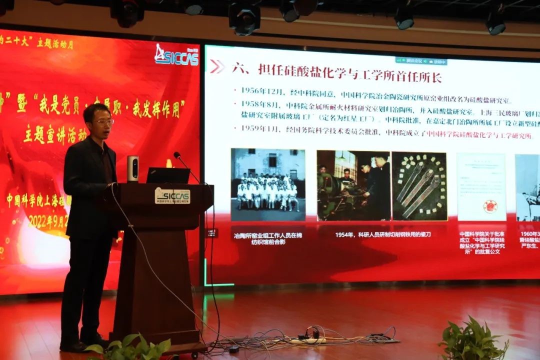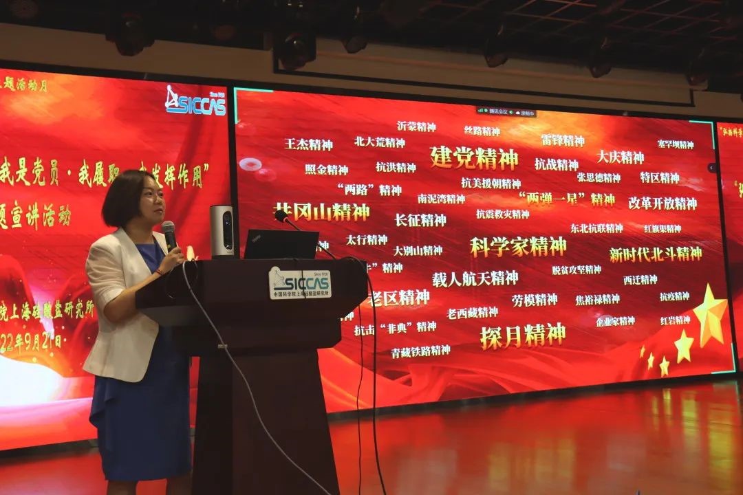 为贯彻落实《中国科学院党的建设工作领导小组办公室关于开展“弘扬科学家精神,喜迎党的二十大”系列活动的通知》和中共中国科学院上海分院分党组《关于开展“我是党员·我履职·我发挥作用”主题党日活动的通知》精神要求,9月21日上午,中国科学院上海硅酸盐研究所举办“弘扬科学家精神”暨“我是党员·我履职·我发挥作用”主题宣讲活动,党支部选派6名中青年党员围绕研究所老科学家事迹等展开讲演。中科院上海分院党建工作部主任兼党群工作处处长朱熊,中国浦东干部学院基层党建研究中心主任吴涛教授,嘉定区委宣传部宣传文化科科长寇曦文,嘉定区菊园新区党工委委员、宣传部部长刘国明,菊园新区沈铃锋、伍天华、楼璐璐,中科院上海分院何静应邀出席。上海硅酸盐所党委书记王东,纪委书记、党委委员杨建华,各党支部书记、科学家精神宣讲团成员和青年理论学习小组成员代表等参加活动。活动以线上线下结合方式举办,近300人聆听讲演报告。活动由所团委委员、特种无机涂层中心邓瑞翔,无机材料分析测试中心张国霞主持。活动伊始,与会人员观看了“上海硅酸盐所老科学家精神”视频。