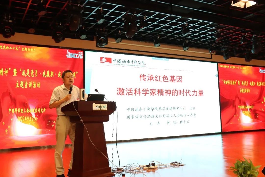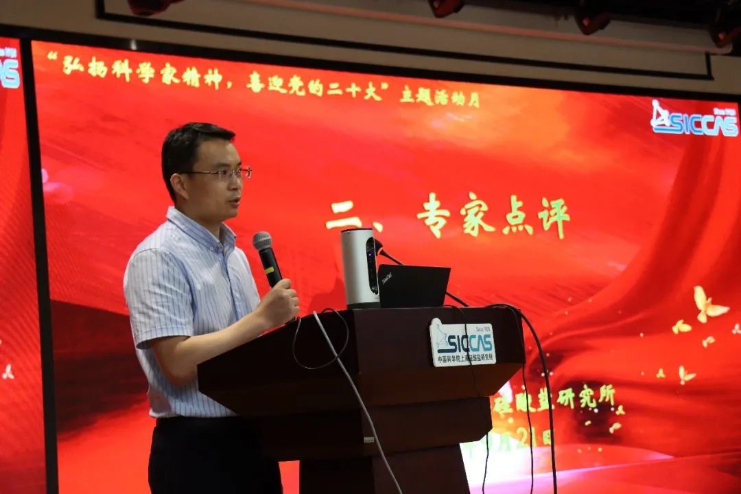 吴涛教授作了题为“传承红色基因激活科学家精神的时代力量”的报告。他从“崇高的信仰信念支撑”、“一以贯之的忧患意识”、“不断自我革命的勇气”、“勤于学习善于学习的本领”、“超强的凝聚人民及社会共识的能力”等五个方面,阐述了如何对科学家精神进行深度挖掘和普及教育,推动党建高质量发展促进更高水平科研成果产出。他在报告中结合对讲演报告和讲演活动的点评,理论联系实际地阐明了报告主题,为后续上海硅酸盐所更好发挥弘扬科学家精神宣讲团作用、在更广层面上“讲好硅所故事”“讲好硅所科学家故事”提供了方法论。