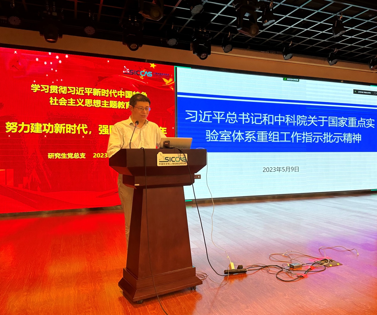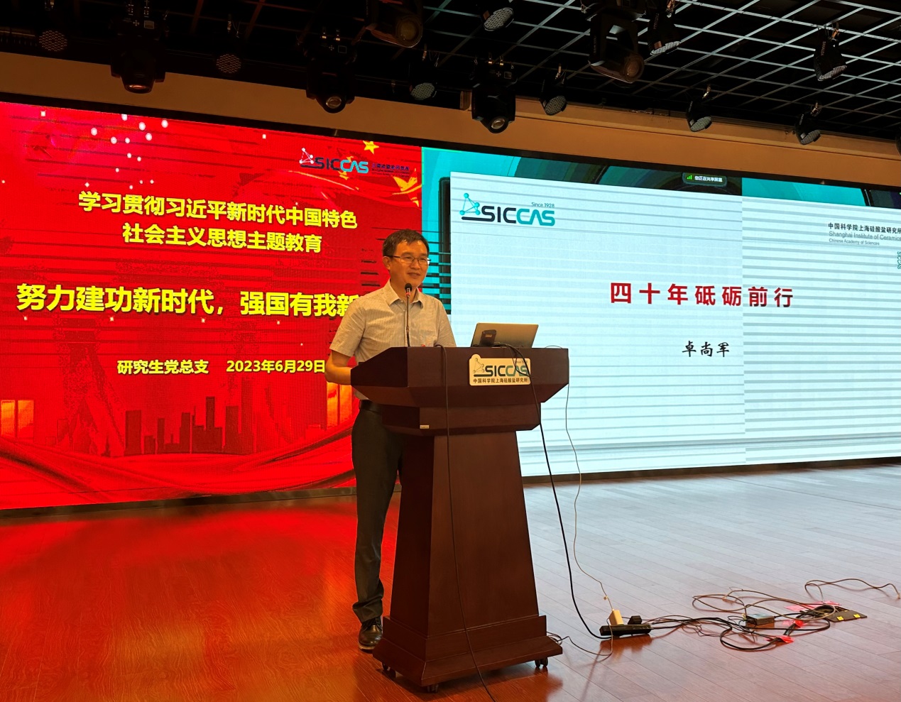 卓尚军讲题为“四十年砥砺前行”的党课。从1983年进入华东师范大学学习、1988年进入上海硅酸盐所学习、工作开始说起,回顾了四十年的学习和科研经历以及四十年的科研情怀,感恩科研道路上的导师陶光仪、殷之文、严东生等大师的指导和教诲。介绍了面向国家需求,无机材料分析测试中心和上海无机质谱中心的建立和发展过程,以及为实现科技创新,突破关键核心技术取得的一系列成就。报告以实例分享了对创新的思考,告诉同学们要坚定“四个自信”,并阐述了中国式现代化是全体人民共同富裕的现代化,中国式现代化是人与自然和谐共生的现代化,中国共产党从来不代表任何利益集团、任何特权阶层,始终把为中国人民谋幸福、为中华民族谋复兴作为自己的初心使命。最后,报告人用党的二十大报告“广大青年要坚定不移听党话、跟党走,怀抱梦想又脚踏实地,敢想敢为又善作善成,立志做有理想、敢担当、能吃苦、肯奋斗的新时代好青年,让青春在全面建设社会主义现代化国家的火热实践中绽放绚丽之花”结束这堂精彩的党课。