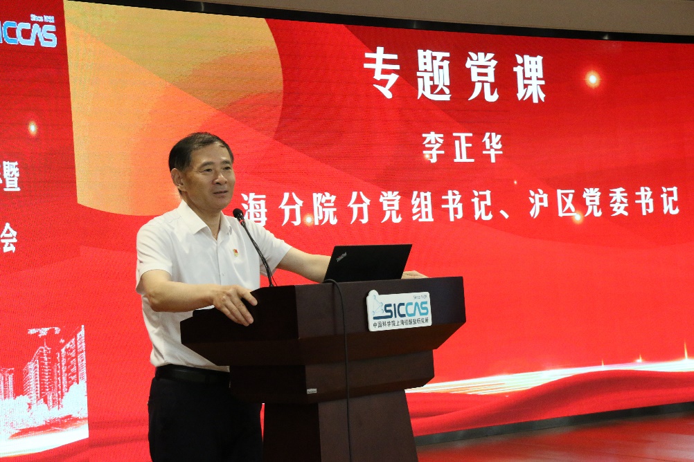 在“党课引领”环节,上海分院分党组书记、沪区党委书记李正华讲授题为“履行国家战略科技力量主力军职责使命,打造科技创新人才高地,为实现高水平科技自立自强提供坚强支撑”专题党课。他传达了中央领导同志调研中国科学院重要讲话精神,分析了当前的形势任务以及上海分院各研究所的发展实际。他指出,要持续深入开展学习贯彻习近平新时代中国特色社会主义思想主题教育,不断强化国家战略科技力量主力军的职责使命,坚持和加强党的领导,着力推进全面从严治党,围绕中心抓党建、抓好党建促发展,持续提升基层党组织的组织力、战斗力、引领力,发挥好基层党组织战斗堡垒作用和党员先锋模范作用,为科技创新提供坚强的组织保证;要牢固树立“创新是第一动力、人才是第一资源”的工作理念,在“推出一批、稳定一批、培育一批、引进一批”四个一批人才队伍建设上下功夫,努力建设一流人才高地;要传承和弘扬好科学家精神,始终“胸怀国之大者”,着力从党的事业、国家力量角度出发,坚持面向国家战略需求,把握正确方向,聚焦主责主业,做专做强做大学科领域,为实现高水平科技自立自强、推进中国式现代化、实现中华民族伟大复兴的中国梦贡献上海硅酸盐所更大的力量。