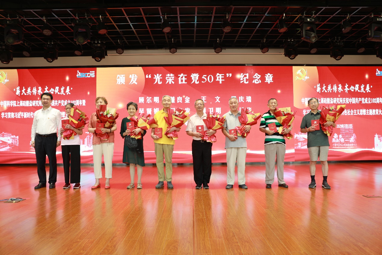 在“薪火传承”环节,研究所有12名老党员荣获“光荣在党50年”纪念章,王东为在场的8位老党员颁发纪念章;离退休党总支部副书记、原上海硅酸盐所党委副书记、纪委书记李树菊,带领史迅、鲁晓珂、周敏剑三位新党员,与现场的党员一起重温入党誓词;李树菊与离退休五支部书记、高级实验师张惠根作为老党员代表作交流发言。