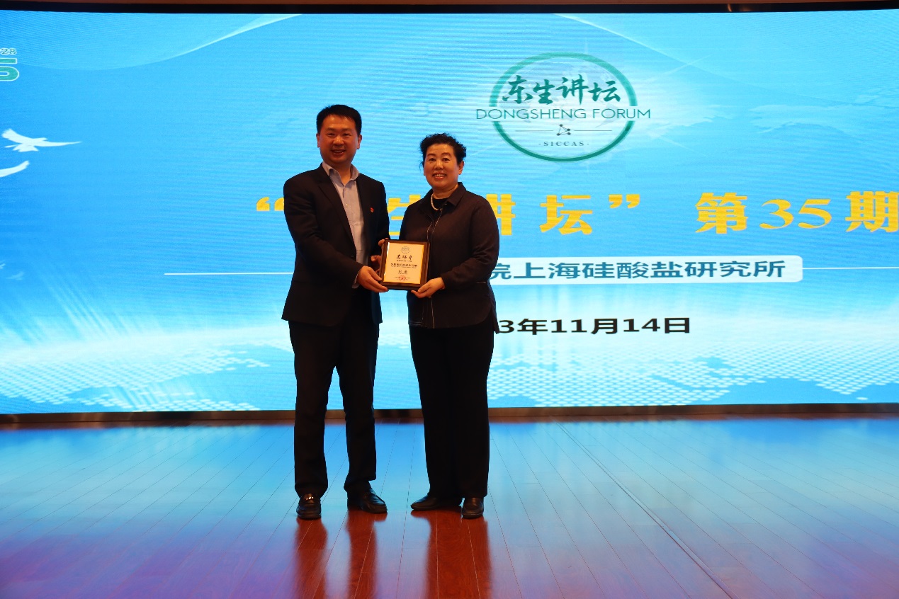 报告会后,王东代表上海硅酸盐所向高瑞平研究员颁发纪念证书,高瑞平研究员为“东生讲坛”第三十五期讲座签名留念。