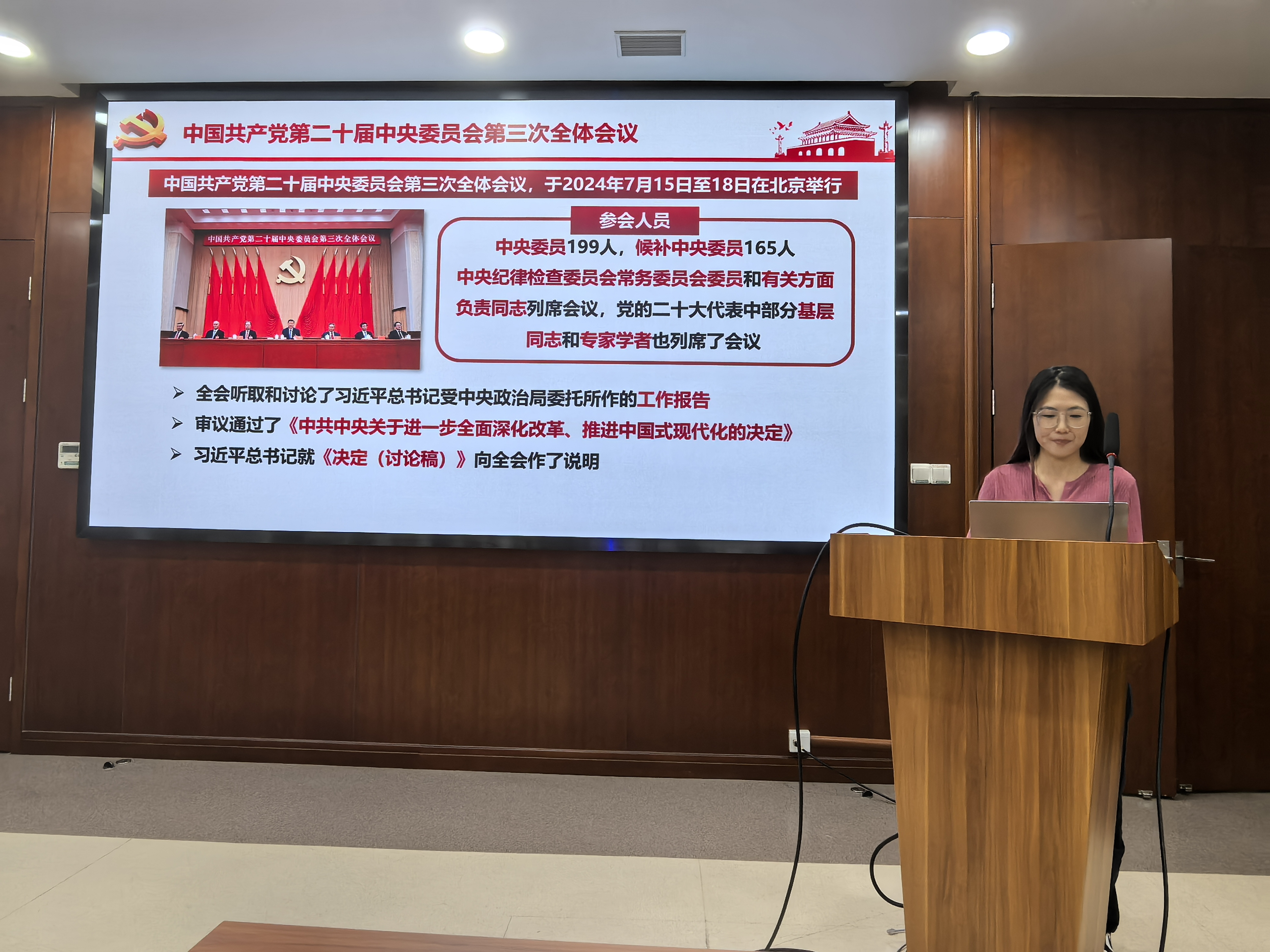 党员讲党课环节中,支部党员施凯莹和王路分别就《学习贯彻党的二十届三中全会精神》作主题党课报告。通过详细介绍和解读,使党员们深入学习了新时代进一步深化改革,推进中国式现代化的重大意义。