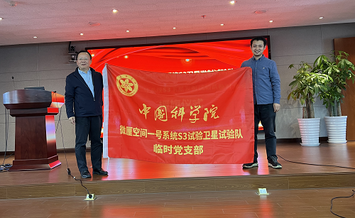 周四根代表卫星创新院党委宣读了关于同意成立S3卫星发射试验队临时党支部的批复,并向临时党支部书记斯朝铭授旗。