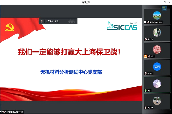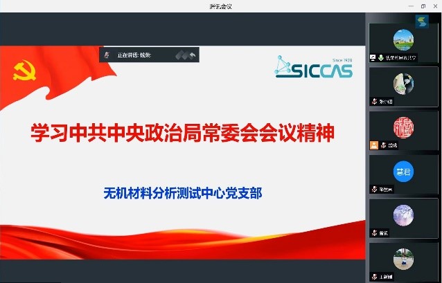 5月9日上午,中国科学院上海硅酸盐所无机材料分析测试中心党支部采用视频会议的方式传达学习中共中央政治局常委会会议精神。会议由党支部书记钱荣主持,党支部全体党员参会。