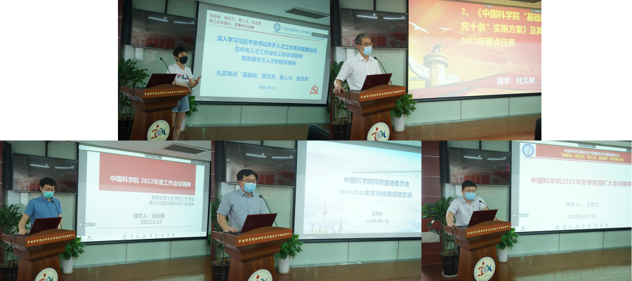 会议还以“强基础、抓攻关、聚人才、促改革”为主旨,领导班子成员带头学习研讨相关重点内容。王燕领学“习近平总书记关于人才工作系列重要论述、习近平总书记在中央人才工作会议上的讲话精神与院党组有关精神”,杜久林领学“中科院‘基础研究十条’实施方案及其2022年重点任务”,王佐仁领学“中科院2021年冬季党组扩大会议精神”,孙衍刚领学“中科院2022年度工作会议精神”,王茂华领学“中科院科研道德委员会2018-2022系列诚信提醒”。通过集中学习交流,统一思想,提振信心,凝聚共识,增强作为“国家队”“国家人”、心系“国家事”、肩扛“国家责”、实现高水平科技自立自强的使命感、责任感和紧迫感,为贯彻落实中科院2022年度工作会议重点任务、明确新时期中心使命定位和目标任务奠定坚实的思想基础。