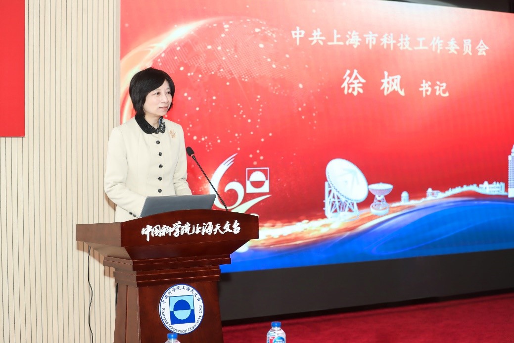 中共上海市科学技术工作委员会书记徐枫代表上海市科技工作党委向上海天文台成立60周年暨建台150周年表示祝贺。她表示,上海市科技工作党委将继续以党建高质量创新发展引领服务科技创新中心工作,为包括上海天文台在内的科技系统各研究院所实现高水平科技自立自强,促进科技系统各单位党建与科技深度融合提供坚强的政治保证。同时她勉励上海天文台肩负起科技强国的时代重任,为上海加快建设具有全球影响力的科创中心,为国家科学事业可持续发展,为建设社会主义现代化国家作出新的更大的贡献。