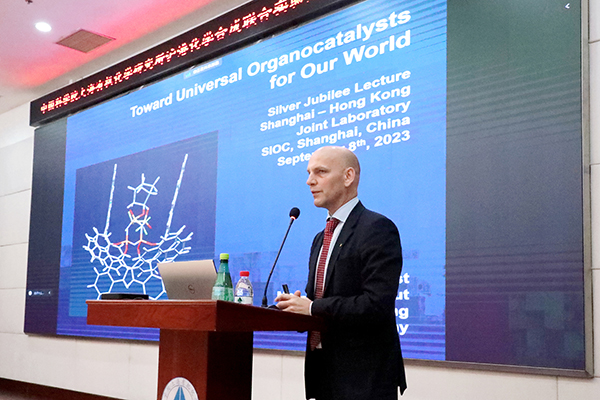 Benjamin List教授在作报告前,首先用中文为沪港化学合成联合实验室成立二十五周年送上诚挚的祝福。他表示,中国化学领域诞生了众多优秀人才,特别是上海有机所的许多毕业生都曾在德国马克思·普兰克煤炭研究所留学。同时他展望于未来马普研究所和上海有机所能够有更多更好的交流合作。