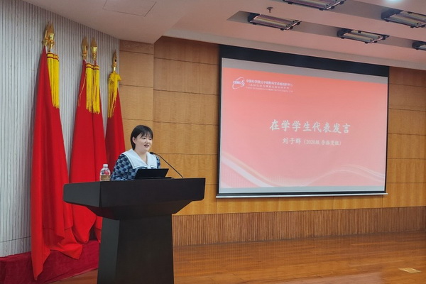 在学学生代表刘子群从科研、生活与信仰三方面向全体新生阐述了自己的科研经历,她鼓励同学们坚定信仰,牢记所训,将国家发展视为己任,坚定地向未来迈进,迎接新时代挑战,在科研创新中谱写青春之歌。