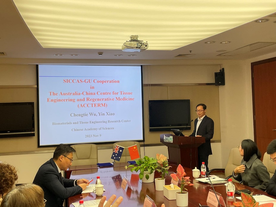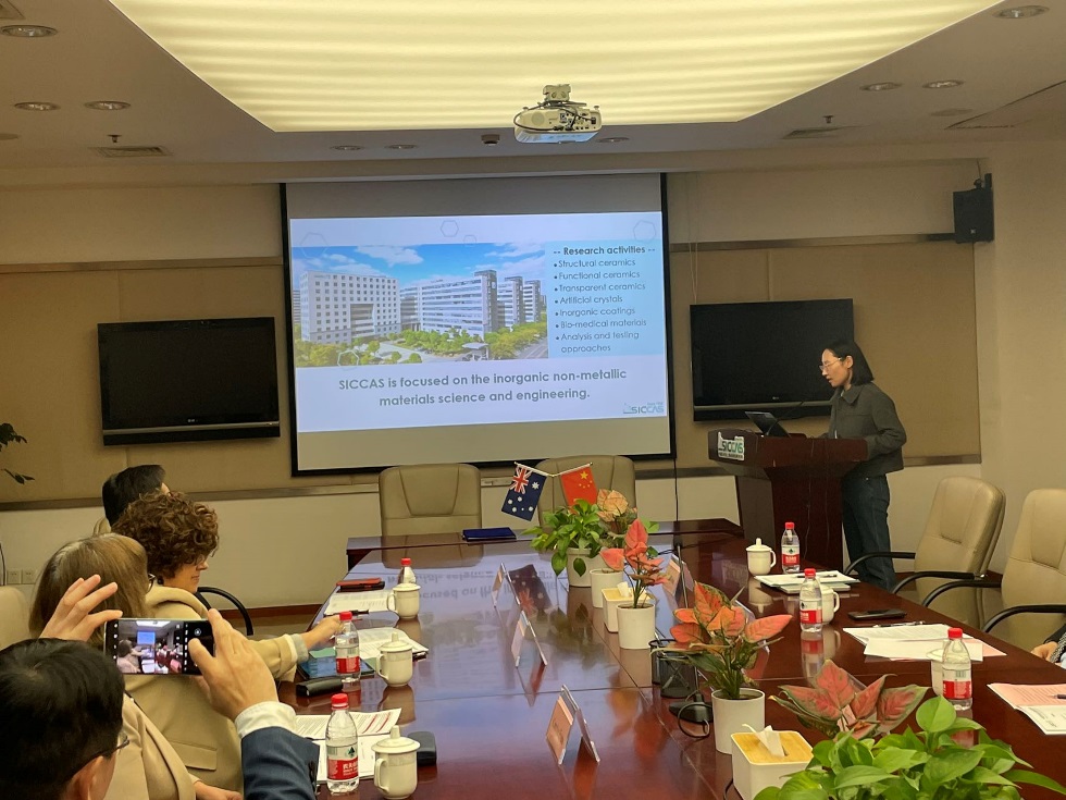 杨建华和Carolyn Evans教授分别代表上海硅酸盐所和格里菲斯大学致辞。杨建华表示,欢迎格里菲斯大学 Carolyn Evans教授一行的到来,期待合作取得预期效果。双方对各自机构的历史发展、主要研究领域等作了简要介绍,朱钰方就上海硅酸盐研究所与格里菲斯大学在组织工程与再生医学中澳中心的合作情况作了介绍。