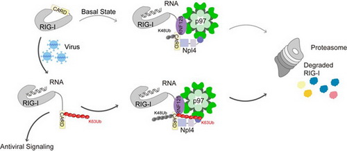 RIG-I-MAVS介导的抗病毒免疫反应在宿主对抗病原体入侵的过程中发挥重要的作用。RIG-I识别病毒RNA,发生构象变化,其CARDs结构域被释放出来,招募TRIM25等E3泛素连接酶,催化RIG-I发生K63泛素化修饰,进而与下游接头蛋白MAVS相结合,传递抗病毒信号。病毒被清除之后,RIG-I-MAVS信号通路需要及时下调或关闭,这个过程由一系列负调控因子参与完成。
