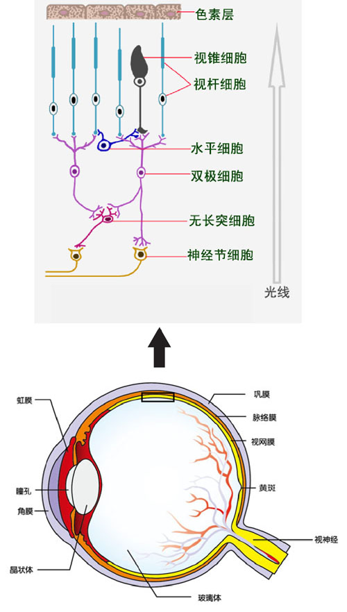 “小杯子”内可不仅仅由涡虫眼点的这两个细胞组成,人类视网膜中大概包含有上千万甚至上亿个细胞。这些细胞主要可以分为六大类:其中包括五类神经元,分别是感光细胞(分为视锥细胞和视杆细胞)、水平细胞、双极细胞、无长突细胞和神经节细胞;还有一类贯穿上下的胶质细胞,即Müller细胞。在视网膜外侧还排列有一层色素上皮细胞,它们和视网膜细胞在空间上排列成相应的顺序结构,从而执行相应的功能。外侧的色素上皮起保护视网膜内神经细胞的作用,内侧的神经元细胞主要负责将外界信息传递到大脑,而胶质细胞则主要起支持神经细胞的功能。它们相互支持,相互配合,共同引