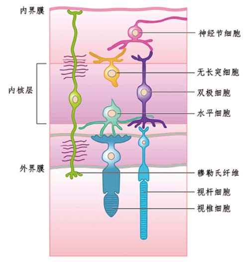 在介绍各类细胞出生顺序之前,先来熟悉一下视网膜内成熟细胞的空间分布。视网膜分布在晶状体之后。外界光线透过晶状体进入视网膜,实现外界与内部的联系。顺着光线的方向,依次排列着神经节细胞、无长突细胞、双极细胞、水平细胞以及感光细胞。