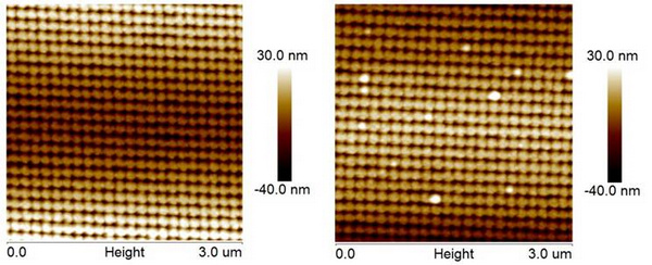 图2:二维点阵结构:生长纳米气泡前(左图)后(右图)的AFM图像。结构周期为138nm,孔的直径为70nm。