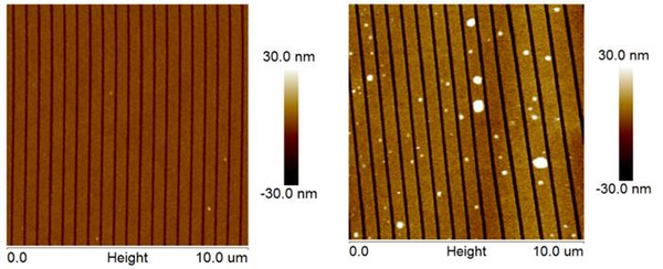 图1:一维结构:沟槽结构上生长纳米气泡前(左图)后(右图)的AFM图像。结构周期为500 nm,线条400nm。