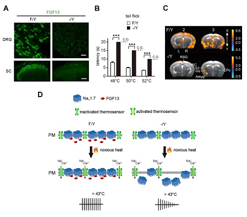 伤害性刺激温度(过热和过冷)、机械和化学刺激可以引起疼痛和逃避反应,从而保护机体不再受到伤害。不同性质的伤害性刺激通过特定的膜蛋白转换成动作电位信号,这些信号沿着感觉神经传入脊椎至大脑。长期以来,神经科学界广泛认为热痛信号的传导与瞬时受体电位阳离子通道V1(TRPV1)等温度感受器有关,然而实验研究结果表明这些温度感受器只是部分地参与热痛传导,提示可能存在未知的热痛传导和调控机理。本研究发现成纤维细胞生长因子13(FGF13)是热痛的关键调控分子,揭示了FGF13对电压门控钠通道Nav1.7的调控作用是热痛的全新分子细胞生物学机理。