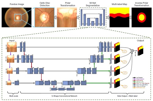 研究人员用极坐标变换(PT)来替代原始眼底图像表达,将椭圆型分割转化为通用的层级分割,增强了位置关系约束,并且将OD和OC分割作为多标签任务。通过使用包含多尺度U形卷积网络的新型端到端深度网络(称为M-Net,框架如图2所示),解决不平衡数据训练的问题,产生多标签概率分布图。在深层模型中,多标签损失函数被用来共同约束OD和OC的协同分割。采用M-Net结合PT的方法,我们在公开数据集ORIGA(包含650张由专业医生标注了OD和OC的眼底图)上达到了目前最高的分割准确率,OD和OC分割的平均重叠率(IOU)分别为92.9%和77.0%。