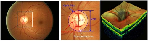 图1 眼底图(左),2D眼底图中的视杯、视盘、盘沿和杯盘比(中)和3D视盘(右)