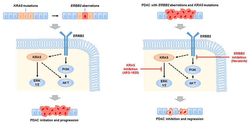 博士研究生李张在王跃祥研究员的指导下,系统分析了PDAC基因组测序数据,发现约8.5%的PDAC含有ERBB2的基因组变化,包括基因突变和基因扩增。ERBB2基因改变频率位于100个酪氨酸激酶基因的首位。有趣的是,含有ERBB2基因改变的PDAC同时含有KRAS突变,并且ERBB2基因改变与PDAC病人的不良预后相关。研究团队利用一些列体外、体内PDAC模型证明了PDAC中ERBB2基因改变具有致癌性,加速了PDAC恶性进展,降低了癌细胞对KRAS的依赖性。研究团队利用人源肿瘤异种移植小鼠模型,证明联合应用ERBB2抑制剂和KRAS抑制剂显著抑制人源PDAC的生长,为靶向ERBB2的药物用于胰腺癌病人的治疗提供了实验依据。