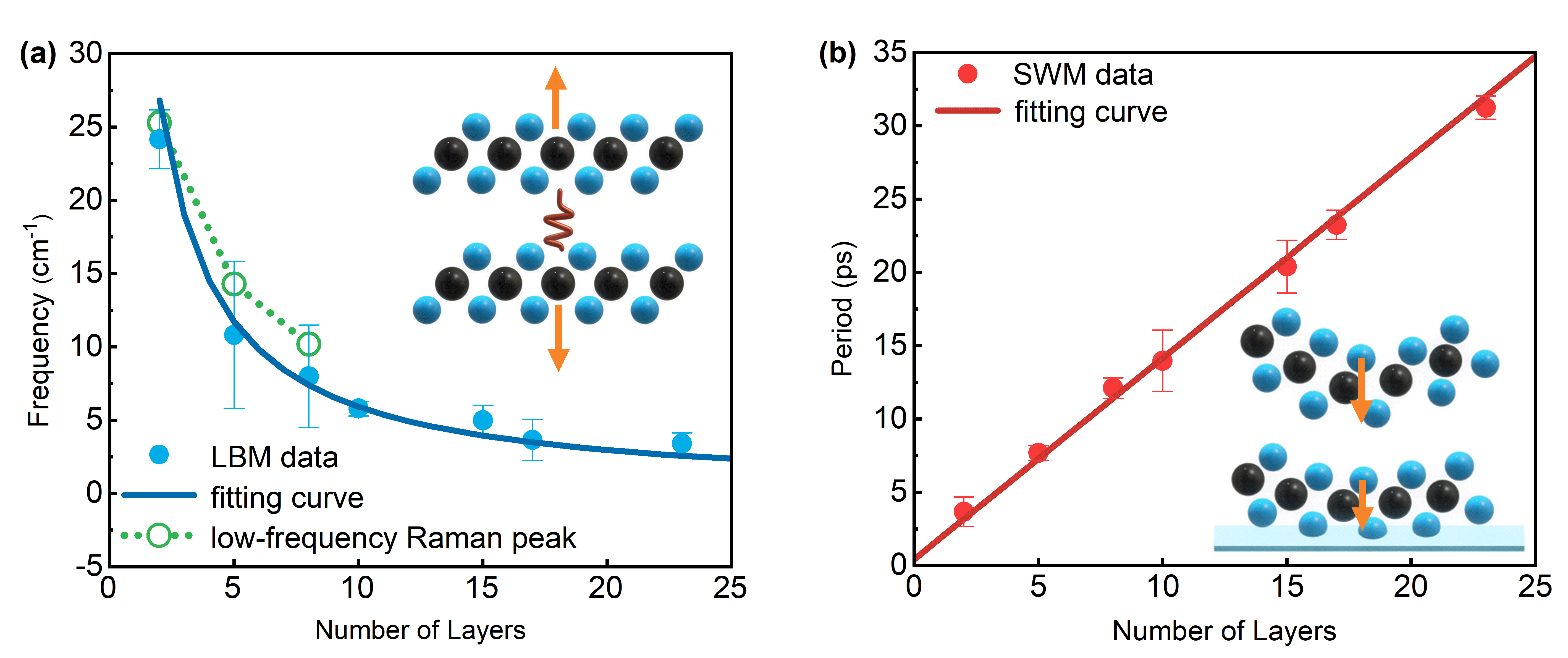 对于层状二维材料PtSe2,由于制备难度大、成本高、层间振动模式频率低等原因,在层间作用力方面的尚未开展广泛研究。研究团队利用超快载流子动力学技术探测出PtSe2的层间作用力的层数依赖特性。在波长为1040nm的飞秒光激发下,PtSe2薄膜发生周期性的晶格振动,从而周期性地调控带隙,并表现为周期性的透过率变化。通过提取透过率变化,获得两种层间振动模式——层间呼吸模式和驻波模式。基于原子链模型和驻波模型,得到PtSe2层间作用力在垂直方向上的大小为7.5 N/(m*atom),远大于经典二维材料石墨烯,并且在实验上测得PtSe2的声速为1720 m/s。