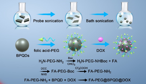 研究团队成功制备了黑磷量子点复合材料(FA-PEG@BPQD@DOX)。制备过程(见图1)分三步:(1)采用溶剂热方法制备尺寸为~5nm的黑磷量子点;(2)利用叶酸配体(FA-PEG)对黑磷量子点表面进行修饰;(3)载入化疗药物阿霉素。