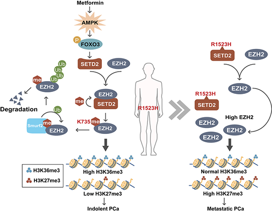研究人员利用小鼠模型及病人数据分析,揭示SETD2的缺失显著促进前列腺癌的远端转移。阐明SETD2通过对EZH2 K735位点甲基化修饰促进EZH2降解,防止细胞转化为高H3K27me3染色质状态,进而抑制转移性前列腺癌的形成的分子机制。EZH2缺失或K735R点突变小鼠模型表明SETD2缺失促进前列腺癌进展主要依赖于其对于EZH2甲基化修饰的调控。有趣的是,SETD2在肿瘤中存在R1523H热点突变位点。该位点突变后可以抑制SETD2与EZH2相互作用进而缺失EZH2的K735位点甲基化修饰。因此,该突变以不改变H3K36me3修饰的方式促进肿瘤进展。此外,本研究还发现AMPK-FOXO3信号通路可以感受胞外能量变化调控SETD2的表达水平。二甲双胍激活AMPK-FOXO3-SETD2信号轴可以抑制EZH2高表达前列腺癌的进展。