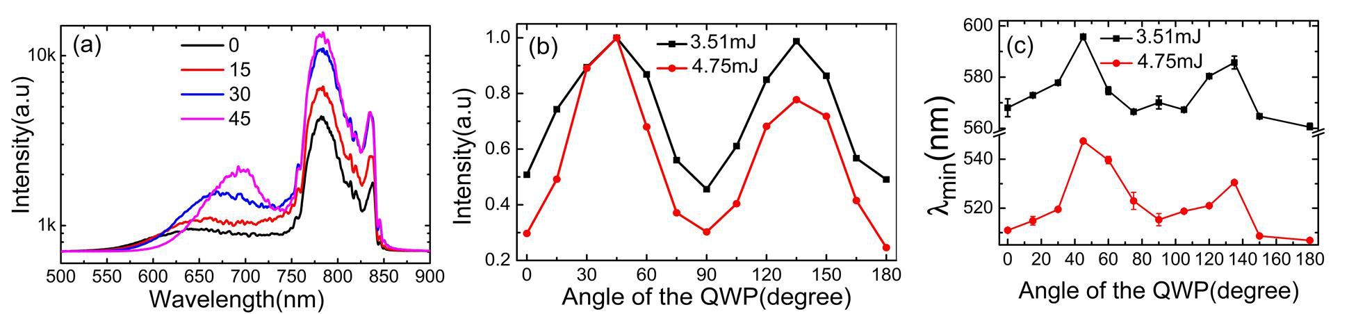 图1 (a)不同激光偏振态下空气中光丝超连续谱光谱图;(b)成丝后光谱强度积分随偏振角度的变化趋势;(c)超连续谱展宽短波部分截止波长 λmin随偏振角度的变化趋势