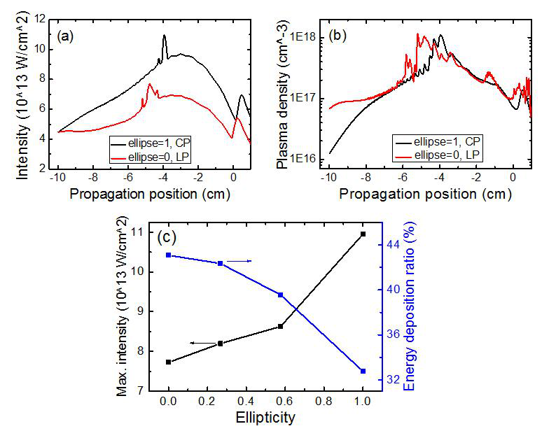 图2 线偏振和圆偏振激光成丝内部激光强度(a)和等离子体密度(b)随传输距离的变化;(c)光丝内部钳制强度(黑色)和能量沉积(蓝色)随激光偏振态的变化