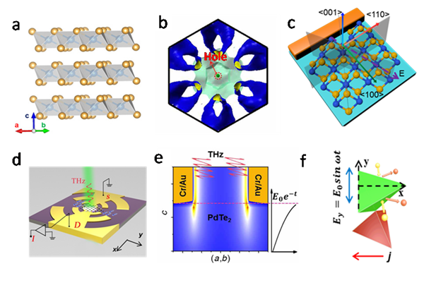 图1.a:Type-II狄拉克拓扑半金属碲化钯(PdTe2)的晶体结构;b:费米面的电子-空穴费米包结构;c:內建电场诱导的对称性破坏;d、e:Log天线集成结构产生周期性局部电子震荡;f:形成横向净电流。