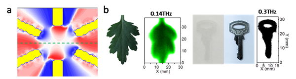 研究人员将具有原子薄层结构的拓扑半金属PdTe2有效集成到天线耦合结构中,PdTe2具有原子堆叠的拓扑对称性加上其强自旋-轨道耦合形成的倾斜狄拉克锥,使得该材料具有各项异性半闭合的费米面以及大的THz吸收系数(图1b)。研究人员还研究发现Cr-PdTe2界面电荷转移形成界面态,通过金属log天线(图1d, 1e)耦合的共同作用(synergistic effect)对PdTe2表面电子产生周期性的驱动震荡(图1f)。由于空间反演的破坏(如内建电场图1c),震荡的电子在晶格C3v旋转势的作用下产生不可抵消的横向电流(图1f所示)和高频电磁整流效应,可以在宽的电磁频率范围内实现高性能探测与成像。