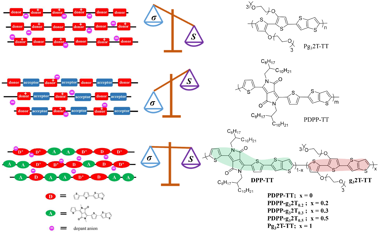 经典的聚噻吩类(上)、给-受体交替型聚合物(中)以及本工作中设计的新型聚合物(下)化学掺杂特征和热电参数关系