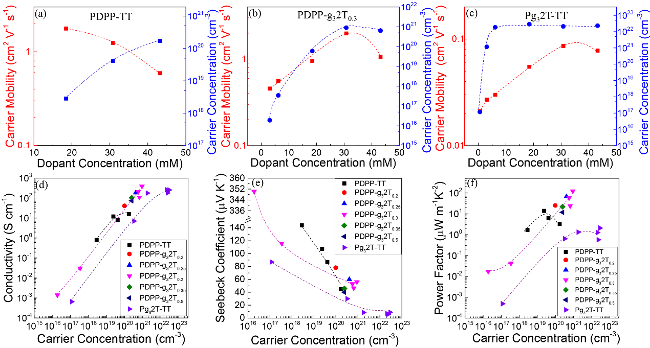 霍尔迁移率和载流子浓度随掺杂浓度的变化趋势以及聚合物热电性能