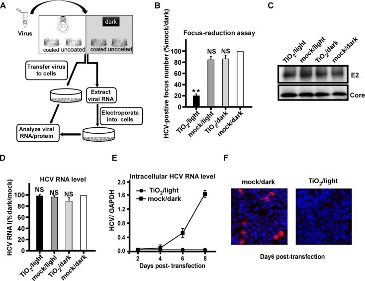 光催化过程对HCV病毒的影响机制:(A)实验流程图,(B)低光照下光催化体外抗病毒效率评价,(C-D)光催化过程对HCV病毒E2蛋白及核心蛋白的影响,(E)光催化过程对病毒RNA增殖的影响,(F)光催化处理后及对照组的病毒RNA转染至Huh7.5.1细胞后对其NS3蛋白的免疫荧光对比