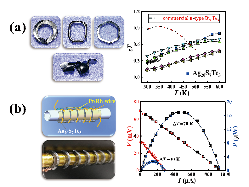 图1.(a)不同形状的 n型Ag20S7Te3无机塑性热电化合物及其热电优值;(b)与曲面热源具有良好结合的Ag20S7Te3基环形热电器件及其输出性能