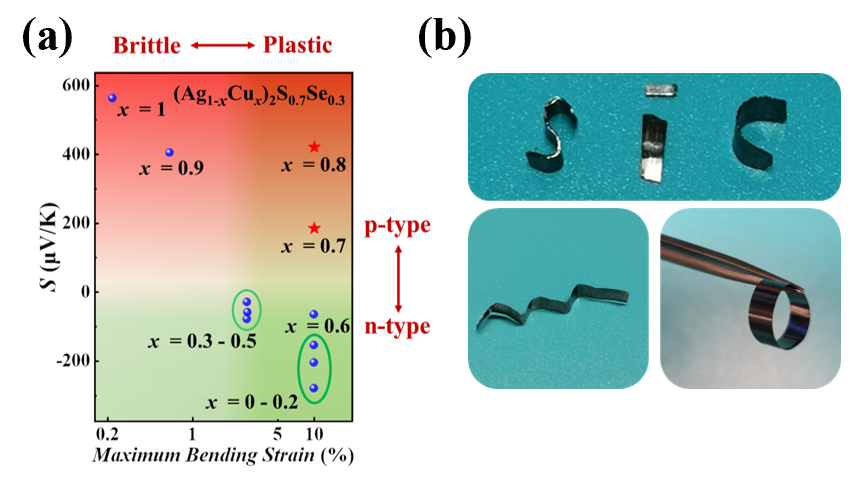 图2.(a)(Ag1-xCux)2S0.7Se0.3泽贝克系数和力学性能随Cu含量的变化;(b)不同形状的p型(Ag0.2Cu0.8)2S0.7Se0.3无机塑性热电化合物;