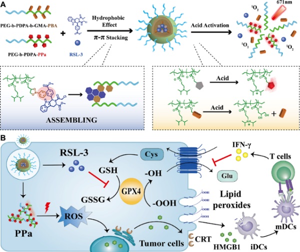 基于上述研究背景,中国科学院上海药物研究所于海军团队提出利用酸敏感递药系统协同诱导肿瘤细胞铁死亡与免疫原性死亡,从而改善抗肿瘤免疫应答的策略。研究人员首先设计合成了偶联光敏剂焦脱镁叶绿酸(PPa)和苯硼酸的两亲性酸敏感高分子嵌段共聚物,通过疏水相互作用和π-π共轭作用包载难溶性的小分子铁死亡诱导剂RSL-3。