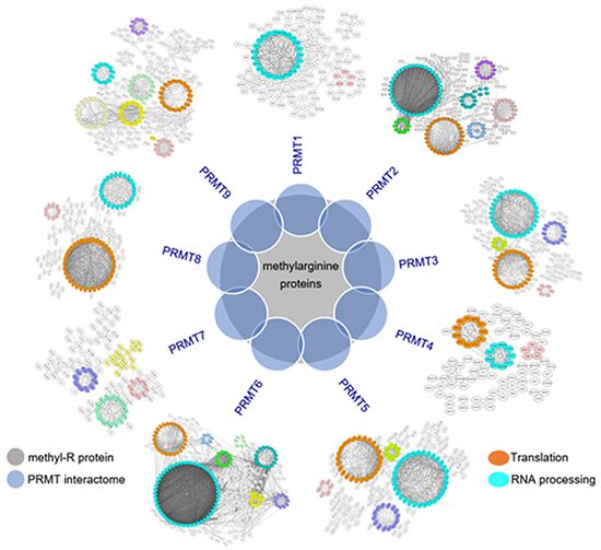 研究显示,人类PRMT互作组与已知的含甲基精氨酸的蛋白质高度重叠,且不同PRMT之间有补偿效应,主要表现为它们底物之间显著重叠,并且底物甲基化基序也具有高度相似性。研究发现PRMT的催化底物主要是参与了mRNA剪接和翻译的RNA结合蛋白(RBP),并且这些RBP含有高度富集的精氨酸甲基化区域。此外,该研究证实抑制PRMT活性可以广泛地改变可变剪接并抑制翻译。值得一提的是,研究发现核糖体蛋白含有大量的精氨酸甲基化修饰,其甲基化位点的突变抑制了核糖体组装、mRNA翻译以及细胞生长。