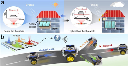 气流传感器在非接触式操纵中的应用:a) 基于气流阈值控制窗户智能开关,b) 利用气流传感器阵列实现无线小车运动方向的实时操控