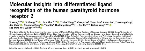 北京时间2021年8月6日,中国科学院上海药物研究所王明伟/杨德华团队和徐华强/赵丽华团队携手蒋华良/程曦团队,于《美国国家科学院院刊》(Proceedings of the National Academy of Sciences of the United States of America)在线发表了题为“Molecular insights into differentiated ligand recognition of the human parathyroid hormone receptor 2”的研究成果。这篇由2012年诺贝尔化学奖得主Robert J. Lefkowitz教授主审的直投(PNAS Direct Submission)论文首次报道了人源甲状旁腺激素受体2(Parathyroid hormone receptor 2, PTH2R)与其内源性配体和Gs蛋白复合物的冷冻电镜结构,揭示了PTH2R的配体选择性、拮抗作用及疾病发生的分子机制,为相关新药的研发奠定了坚实的基础。