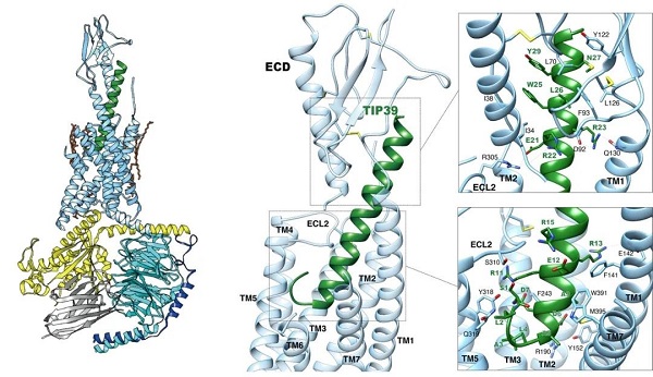 图1. TIP39激活的PTH2R与Gs蛋白的冷冻电镜结构。左,TIP39–PTH2R–Gs复合物结构;右,TIP39与PTH2R结合模式。