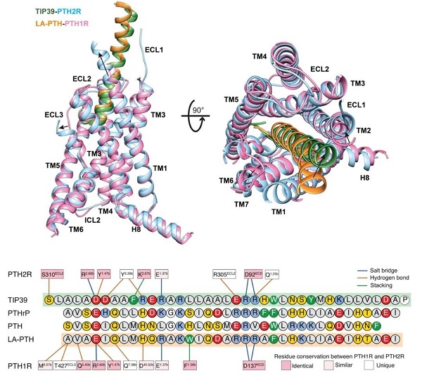 图2. PTH1R和PTH2R特异性识别配体的分子基础。上,PTH2R结合TIP39与PTH1R结合LA-PTH的构象比较;下,配受体作用模式图。