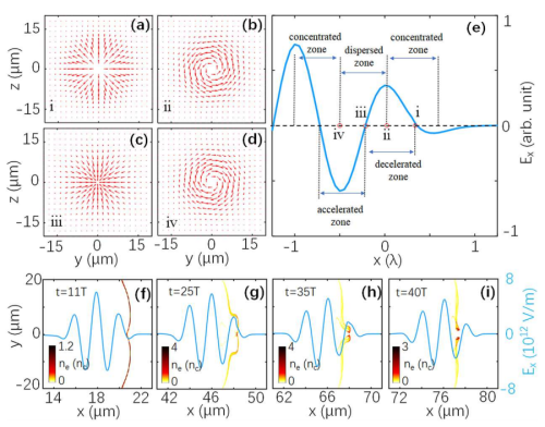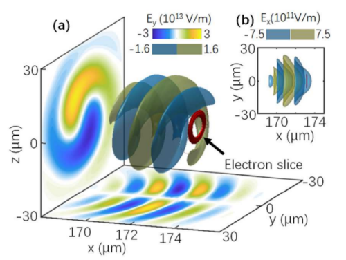 涡旋激光由于其特殊的光场结构,被广泛应用于弱光光镊、强光粒子操控等研究。该项研究中,研究人员发现涡旋激光自身光场可以提供一个类似“空泡”的结构,其纵向加速电场可以稳相加速电子束至数百MeV。通过载波包络相位调制相对应的横向电场强度,可以实现对电子片形状的不同调制。三维粒子模拟结果显示:在特定载波包络相位下,电子片可被调制成一个内直径约10微米的电子环,其纵向时间尺度约为670阿秒,电荷量约0.19纳库伦。 该高能环状电子束可应用于准直线性加速器中产生的反质子束,边缘增强电子成像,特殊结构 x 或γ射线产生,纳米材料分析与操控等潜在方向。